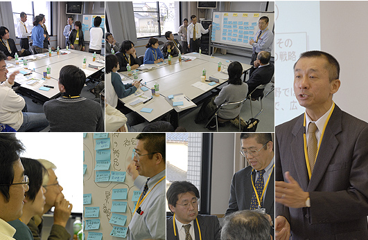 ワークショップには富山大学の碇谷研究員も参加者に加わり、11名の参加メンバーでスタートした。ファシリテータを務める大迫氏から、PCM(Project Cycle Management) 手法によるワークショップの進め方について説明がなされた。作業は自分の考えやアイディアをカードに記入し、ボードに貼り整理・検証しながら合意に基き議論を進める方式で進められる。