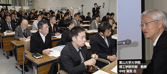 開校記念セミナーの司会進行役の丸山育子(KNBリポーター)より、本年度より本格稼働する富山大学地域再生塾が、国・地方自治体・関係機関・地域企業・地域金融・地域メディア連携型の人材育成にチャレンジし、塾生の低炭素循環型の地域づくり実践的プロジェクト提案に産学官金メディアが一丸となって支援する旨を紹介した。